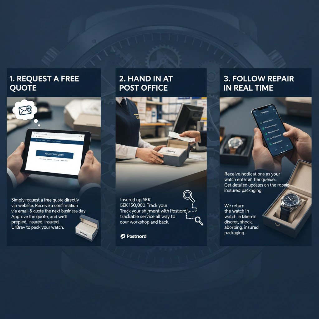 We specialize in repairs and service of all kinds of watches, everything from simple quartz watches to automatic and manual watches. UrBrev is Sweden’s first completely online-based watchmaker and all our repairs and service cases are carried out on site in our workshop in Landskrona.